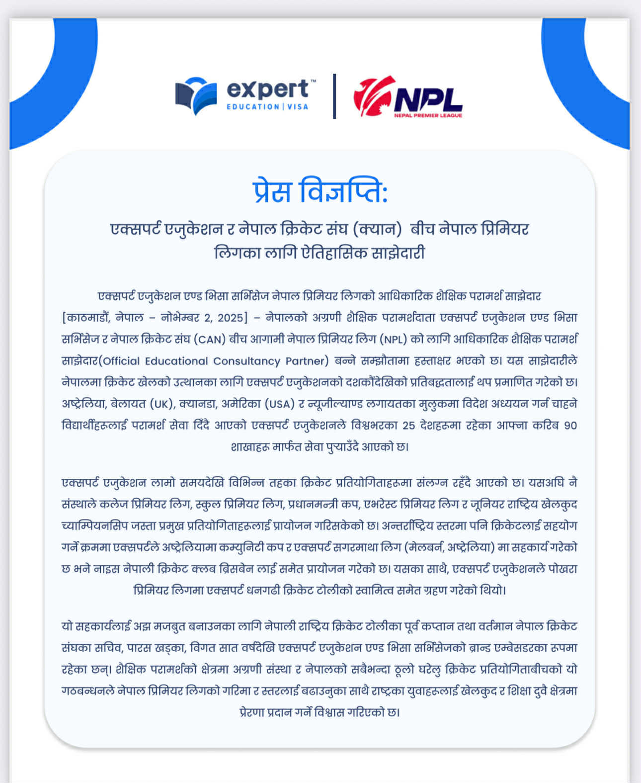 काठमाडौं । एक्सपर्ट एजुकेसन एण्ड भिसा सर्भिसेज प्रालि नेपाल प्रिमियर लिगको शैक्षिक परामर्श साझेदार बनेको छ । नेपाल क्रिकेट संघ ( क्यान) र एकसपोर्ट एजुकेसन बीच नोभेम्बर २ मा सहकार्यको सम्झौता भएको हो ।