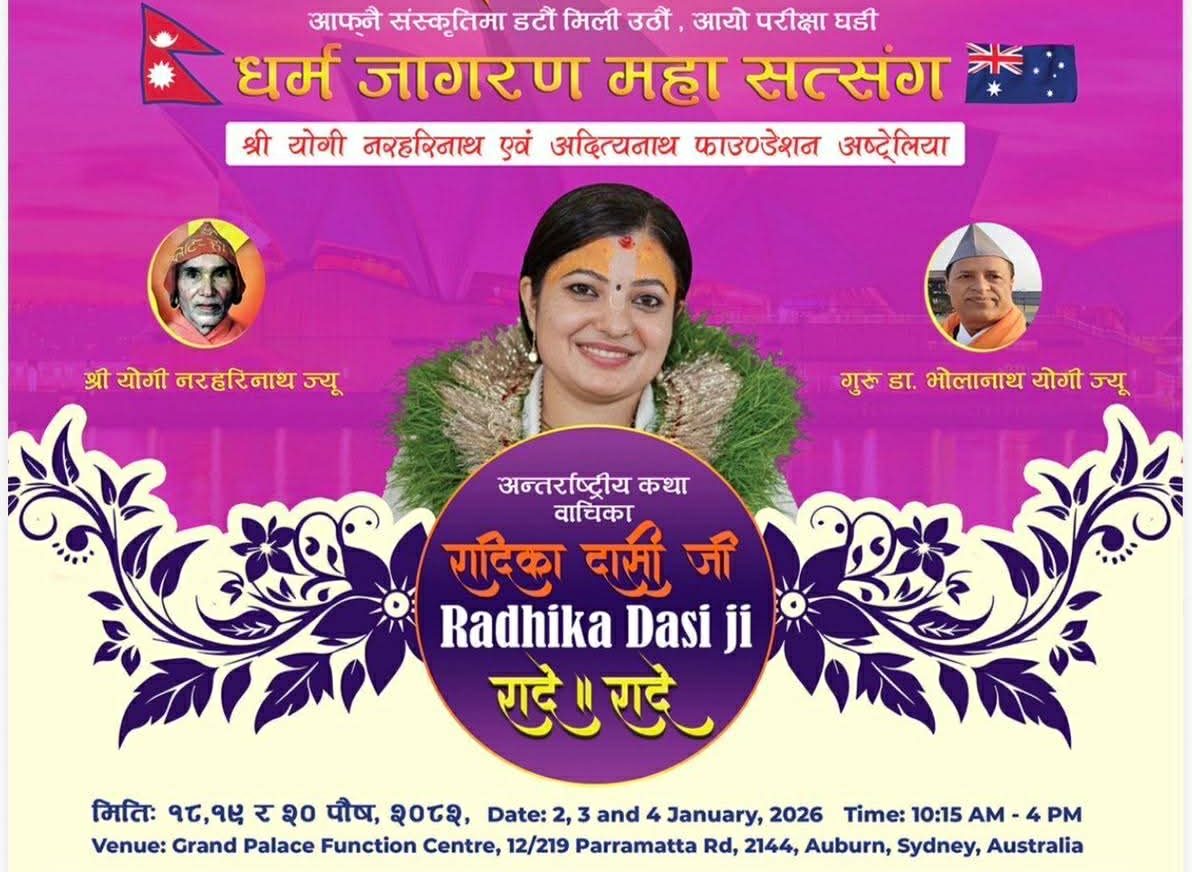 काठमाडौं । अष्ट्रेलियाको सिड्नीमा जनवरी २ तारिखबाट ‘धर्म जागरण महासत्संग’ धार्मिक–सांस्कृतिक महोत्सव आयोजना हुने भएको छ । सिड्नीस्थित ग्रान्ड प्यालेस रिसेप्सनमा आयोजना हुने धार्मिक महोत्सवमा अन्तर्राष्ट्रिय ख्यातिप्राप्त कथा वाचिका राधिका दासी जीको विशेष कथा प्रवचन रहनेछ।