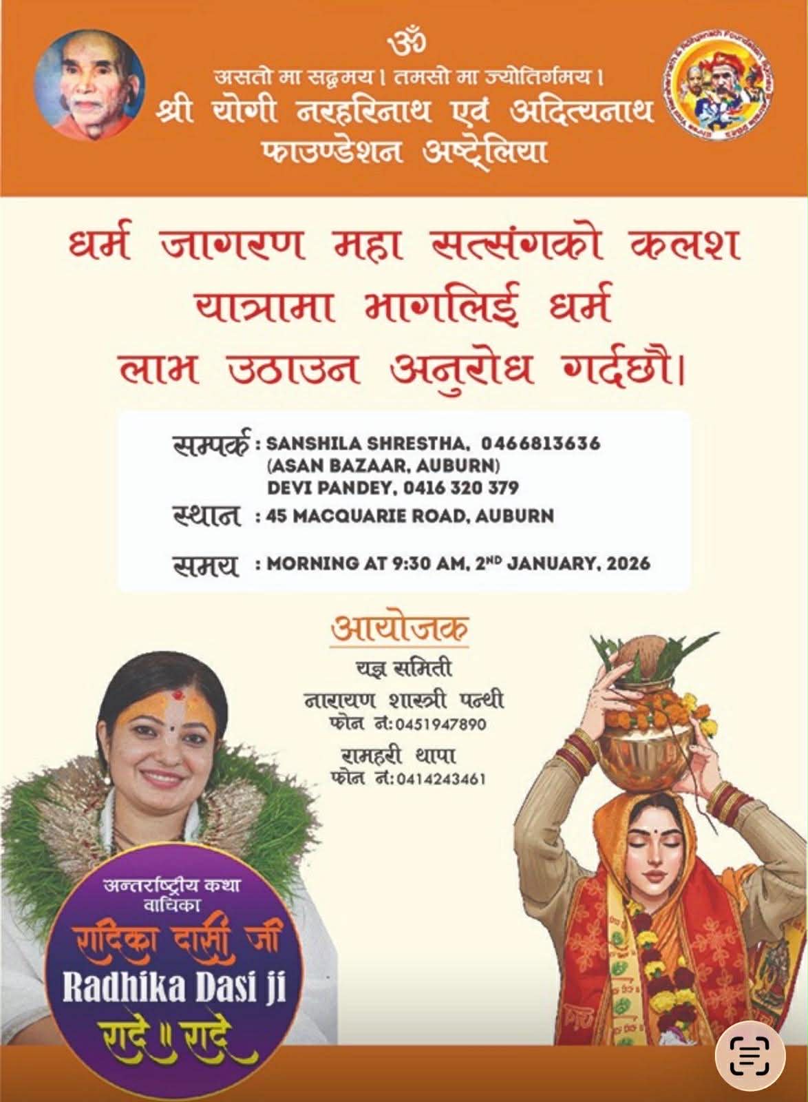 जनवरी २, ३ र ४ तारिखमा तीन दिनसम्म सञ्चालन हुने धार्मिक–सांस्कृतिक महोत्सवको शुभारम्भ सनातन हिन्दू परम्परा र संस्कारलाई जीवन्त बनाउने कलश यात्राबाट गरिने आयोजकले जानएको छ । कलश यात्रा 45 Macquarie Rd, Auburn बाट बिहान ९:३० बजे सुरु हुनेछ।