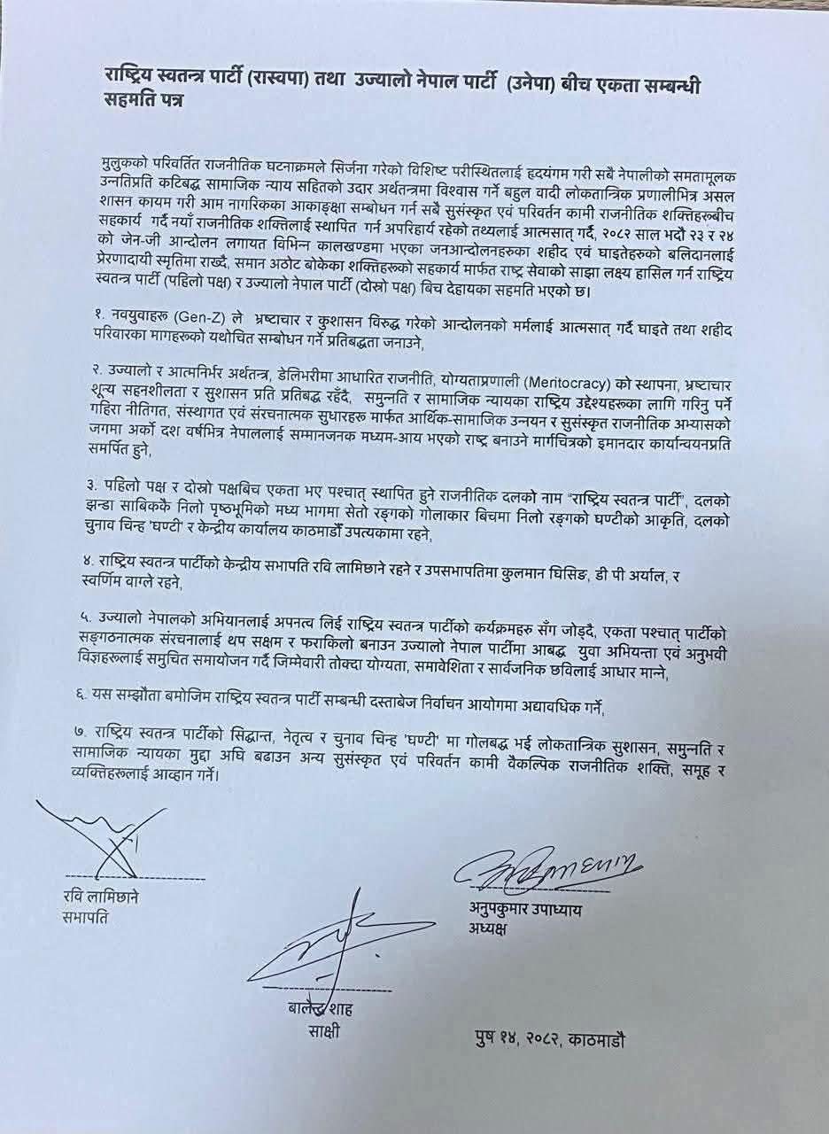 सोमबार अबेरराति रास्वपा सभापति रवि लामिछाने र घिसिङबिच बालेन शाह साँची बसेर ७ बुँदे सहमति भएको छ ।  लामो वार्तापछि भएको सहमति पत्रमा रवि, बालेन र उज्यालो नेपालका अध्यक्ष अनुपकुमार उपाध्यायले हस्ताक्षर गर्नुभएको छ । ७ बुँदे सहमतिको पाँचौं बुँदामा उज्यालो नेपाल अभियानको अपनत्व रास्वपाले लिने भनिएको छ ।