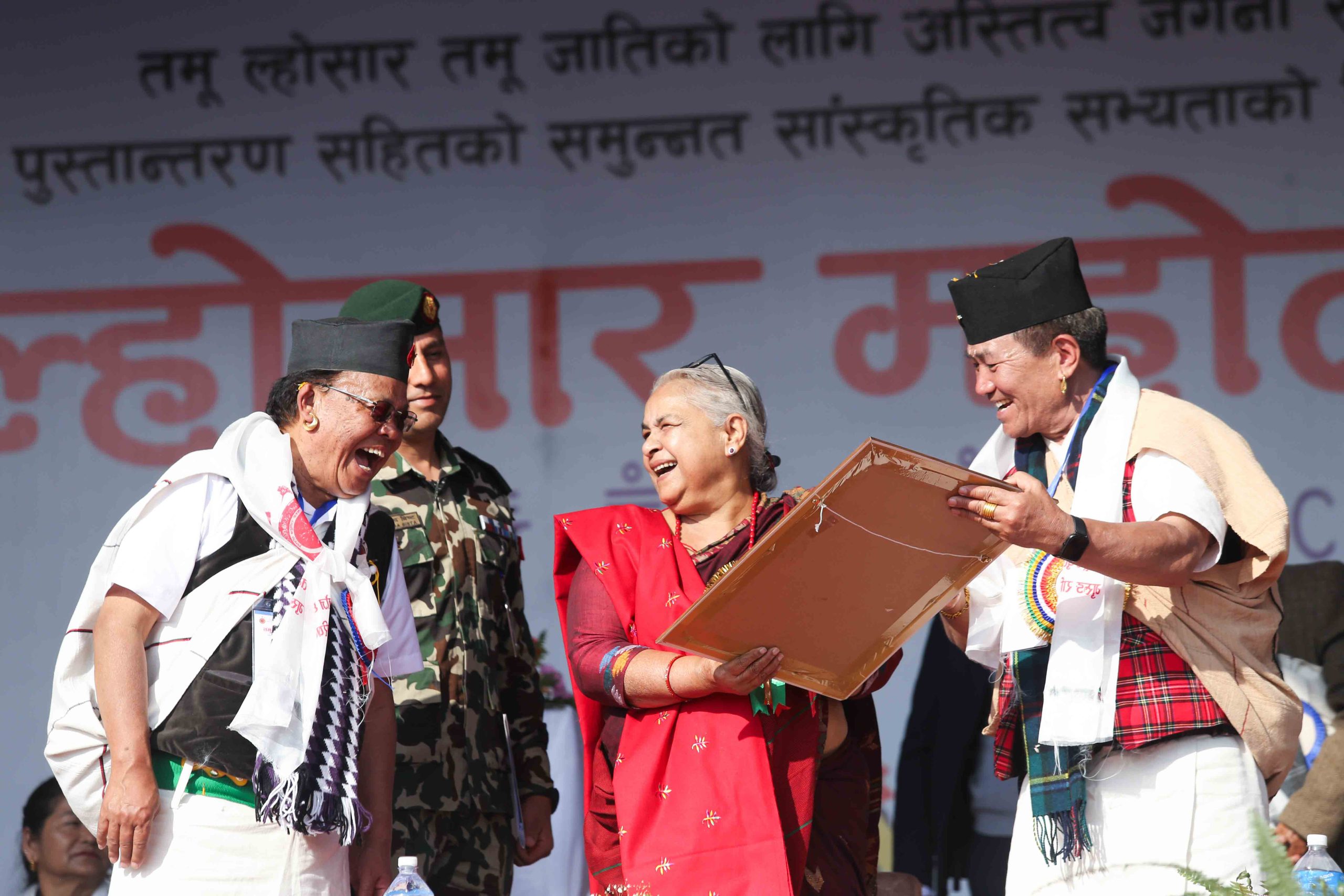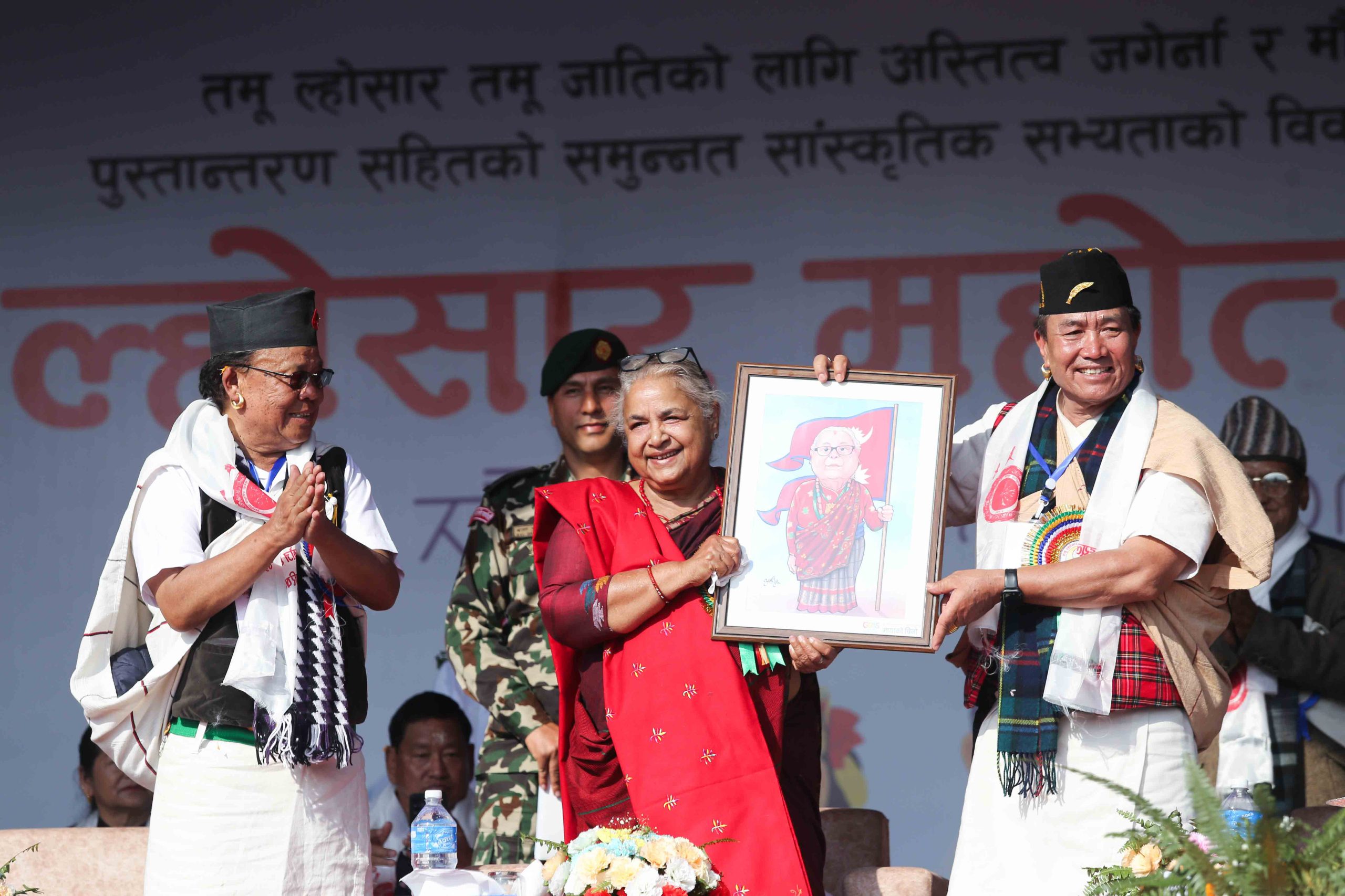 तेह्रथुमे ढाकाको साडीमा सजिएर टुँडीखेल पुग्नुभएकी प्रधानमन्त्री कार्कीलाई आयोजकले उहाँकै स्केच फ्रेम गरेर उपहार दिएपछि मज्जाले हास्नुभएको छ । गुरुङ पहिरन लगाएर नेपालको झण्डा बोकेको स्केच आयोजकले उहाँलाई उपहार दिएका थिए । Photo-NPL