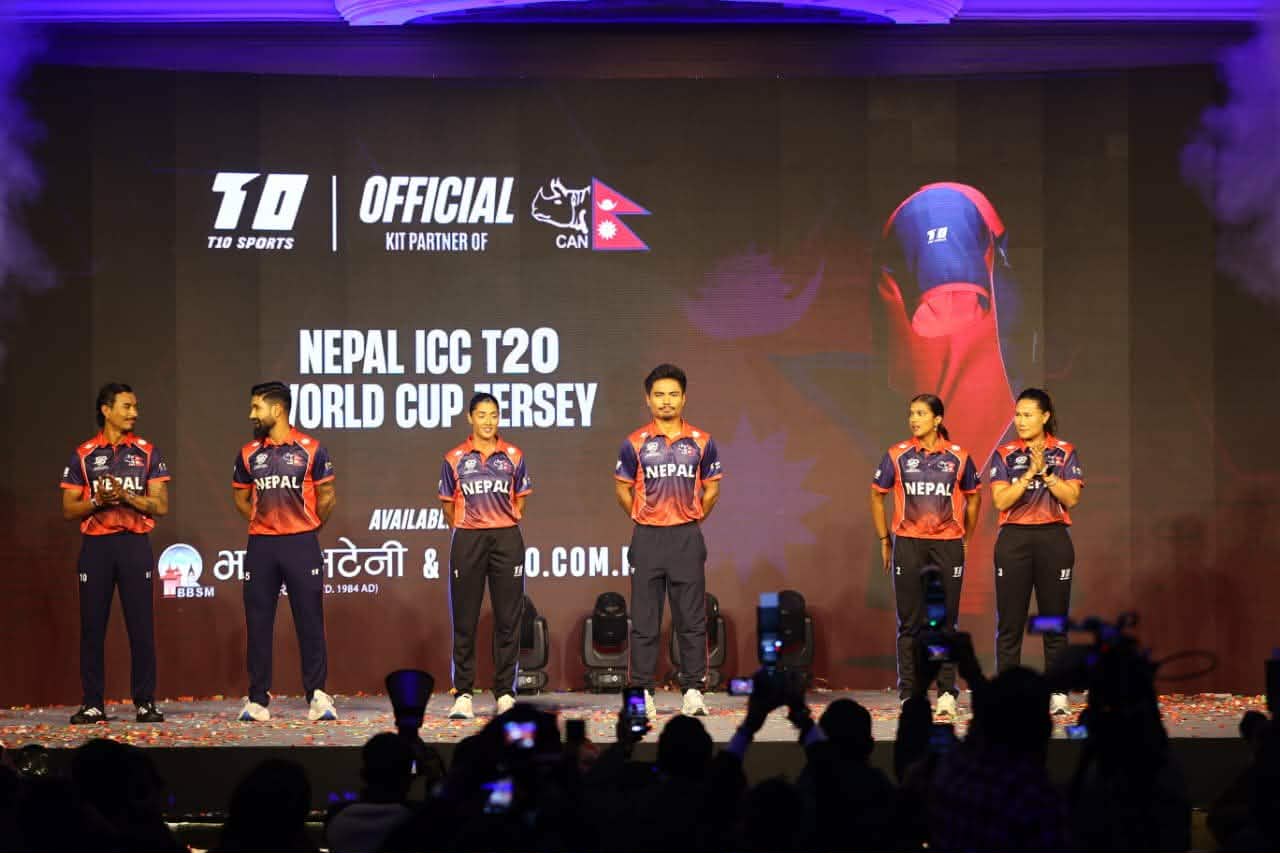 काठमाडौं । नेपालमा टी–२० विश्वकप क्रिकेटको ट्रफी प्रदर्शनीमा ल्याइएकै बेला नेपाली टिमको नयाँ जर्सी सार्वजनिक गरियो । सन् २०२६ फेब्रुअरी ७ देखि मार्च ८ सम्म भारत र श्रीलंकामा हुने आईसीसी पुरुष टी-२० विश्वकपका लागि नेपाल क्रिकेट संघ (CAN) र आधिकारिक किट पार्टनर ‘T10 Sports’ को सहकार्यमा जर्सी सार्वजनिक गरिएको हो ।