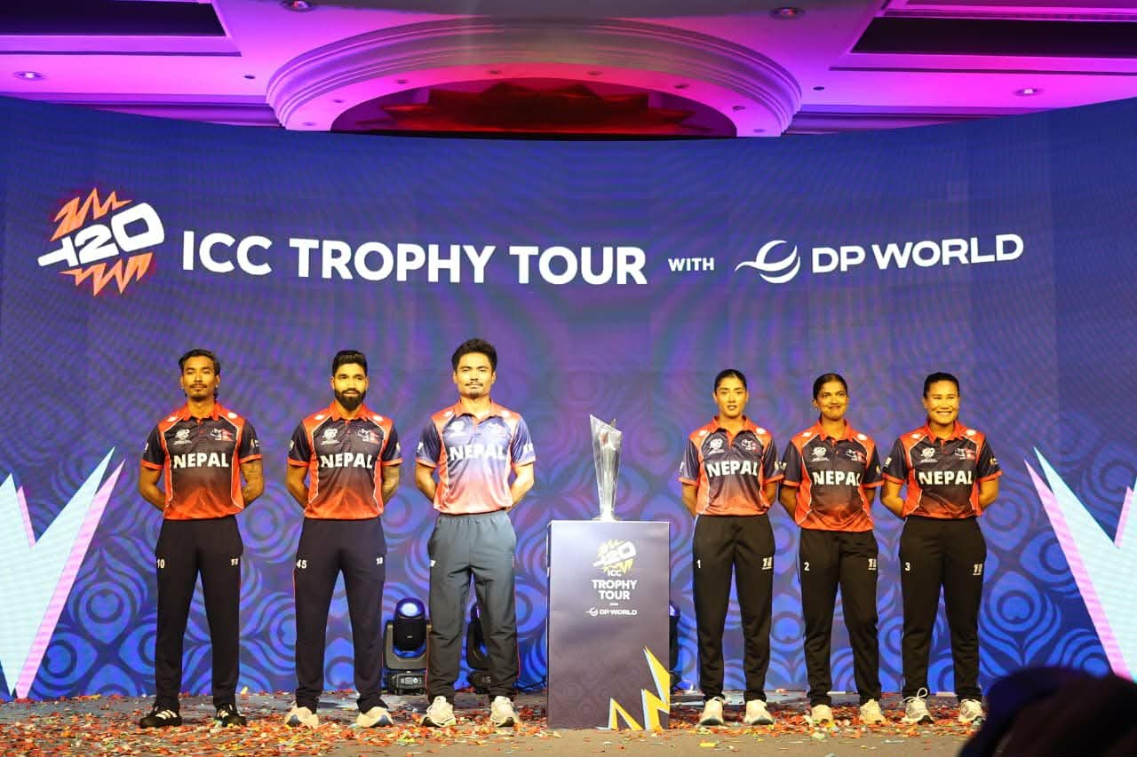 काठमाडौं । नेपालमा टी–२० विश्वकप क्रिकेटको ट्रफी प्रदर्शनीमा ल्याइएकै बेला नेपाली टिमको नयाँ जर्सी सार्वजनिक गरियो । सन् २०२६ फेब्रुअरी ७ देखि मार्च ८ सम्म भारत र श्रीलंकामा हुने आईसीसी पुरुष टी-२० विश्वकपका लागि नेपाल क्रिकेट संघ (CAN) र आधिकारिक किट पार्टनर ‘T10 Sports’ को सहकार्यमा जर्सी सार्वजनिक गरिएको हो ।