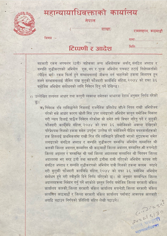 काठमाडौं । महान्यायाधिवक्ता कार्यालयले पूर्व गृहमन्त्री रवि लामिछानेविरुद्ध विभिन्न जिल्ला अदालतमा चलिरहेको संगठित अपराध र सम्पत्ति शुद्धिकरणको अभियोग फिर्ता लिएर सहकारी ठगीको मुद्धालाई मात्रै प्रक्रियामा लग्नेगरि सम्बन्धित सरकारी वकिलहरूलाई स्वीकृति दिएको छ ।
