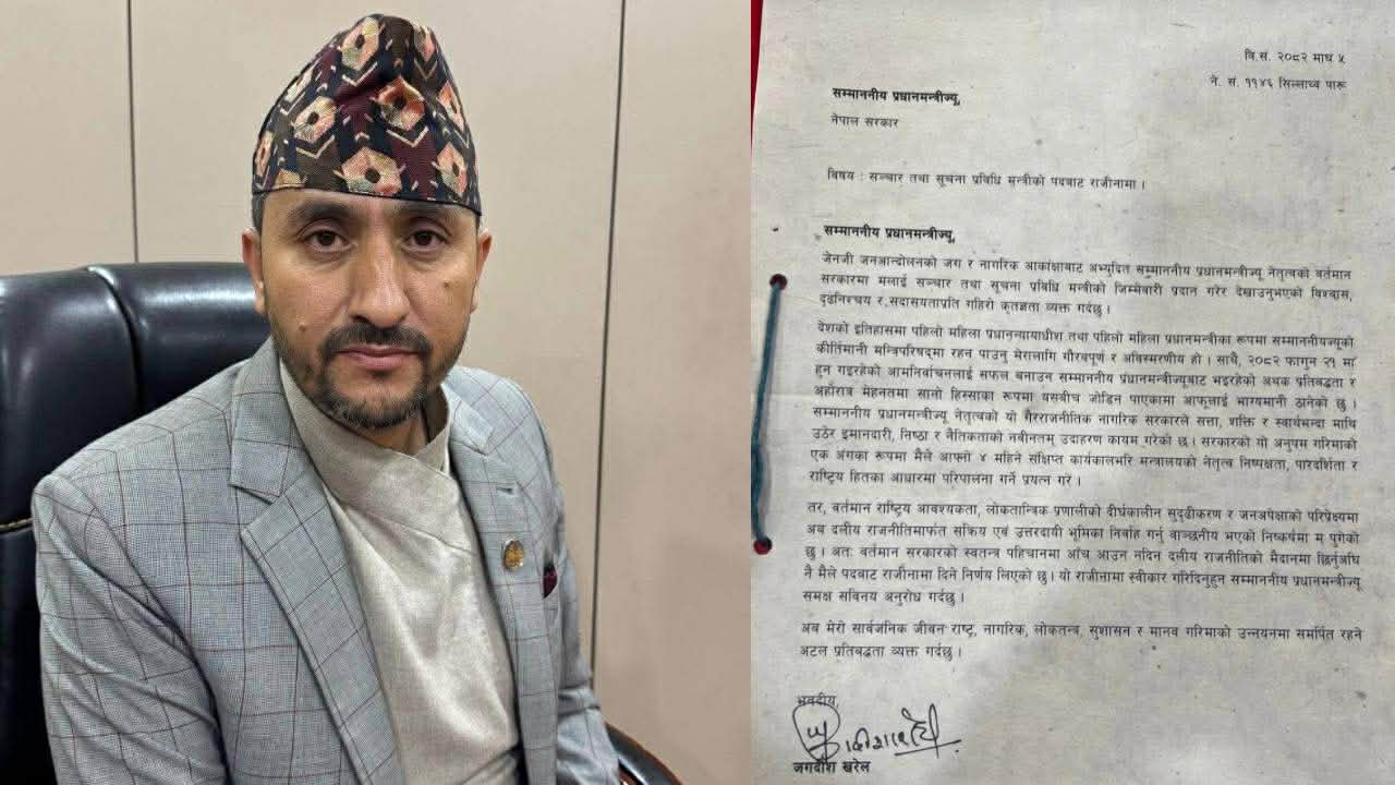 काठमाडौं । सञ्चार तथा सूचना प्रविधिमन्त्री जगदीश खरेलले राजीनामा दिनुभएको छ ।