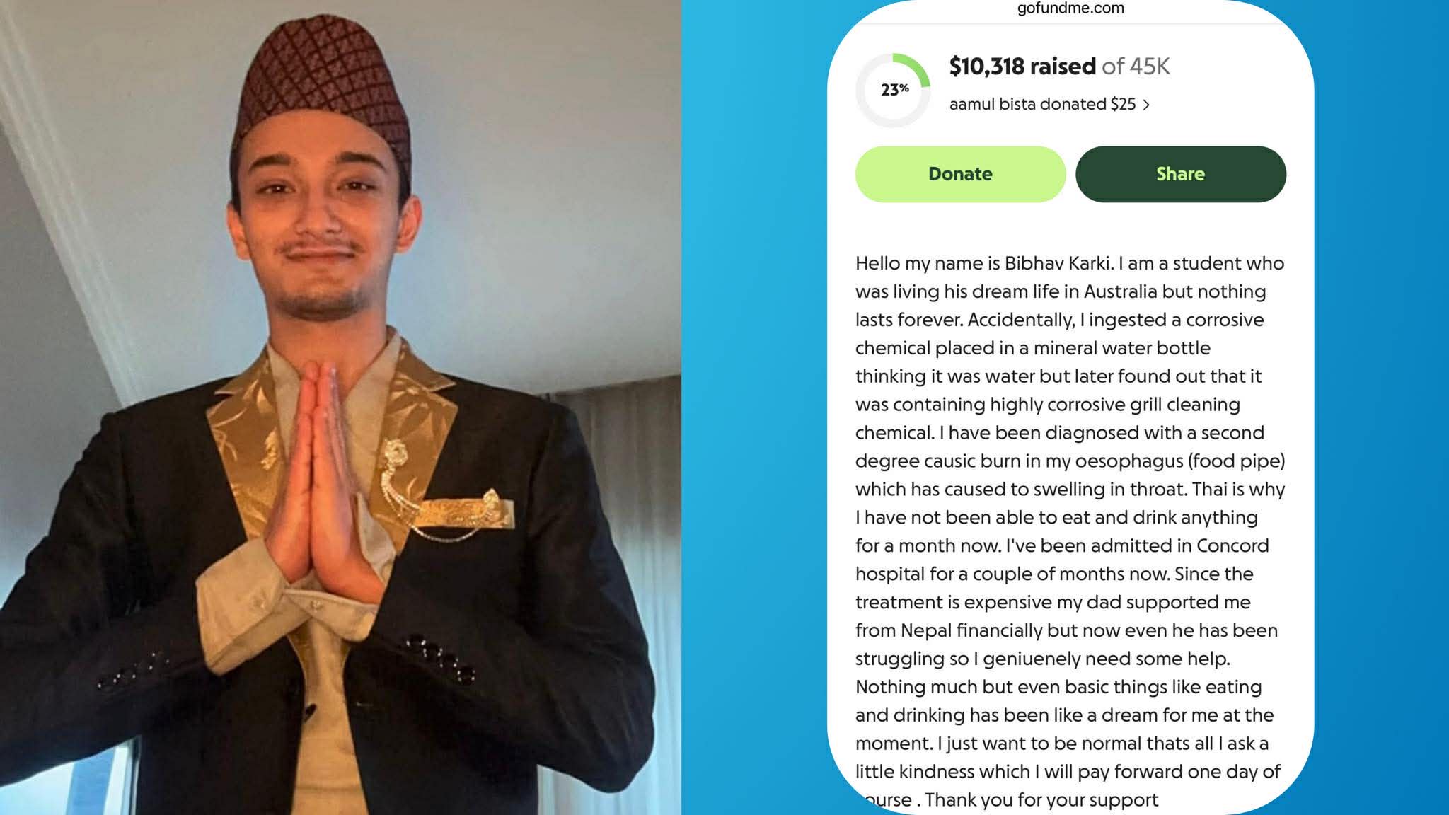सन २०२२ मा अष्ट्रेलिया पुग्नुभएका विभवको गत मे महिनामै विभिन्न कारणले ईन्सुरेन्स रद्ध भएको छ । विद्यार्थीका रुपमा अध्ययनरत कार्कीले घरपरिवारबाट ४०,४५ हजार अष्ट्रेलियन डलर मगाइसक्नु भएको छ । आर्थिक अभावमा पर्नुभएका कार्कीलाई गो फण्डमीको यो लिंकगो फण्डमीको यो लिंकमा गएर सकेको सहयोग गर्न सक्नुहुनेछ ।