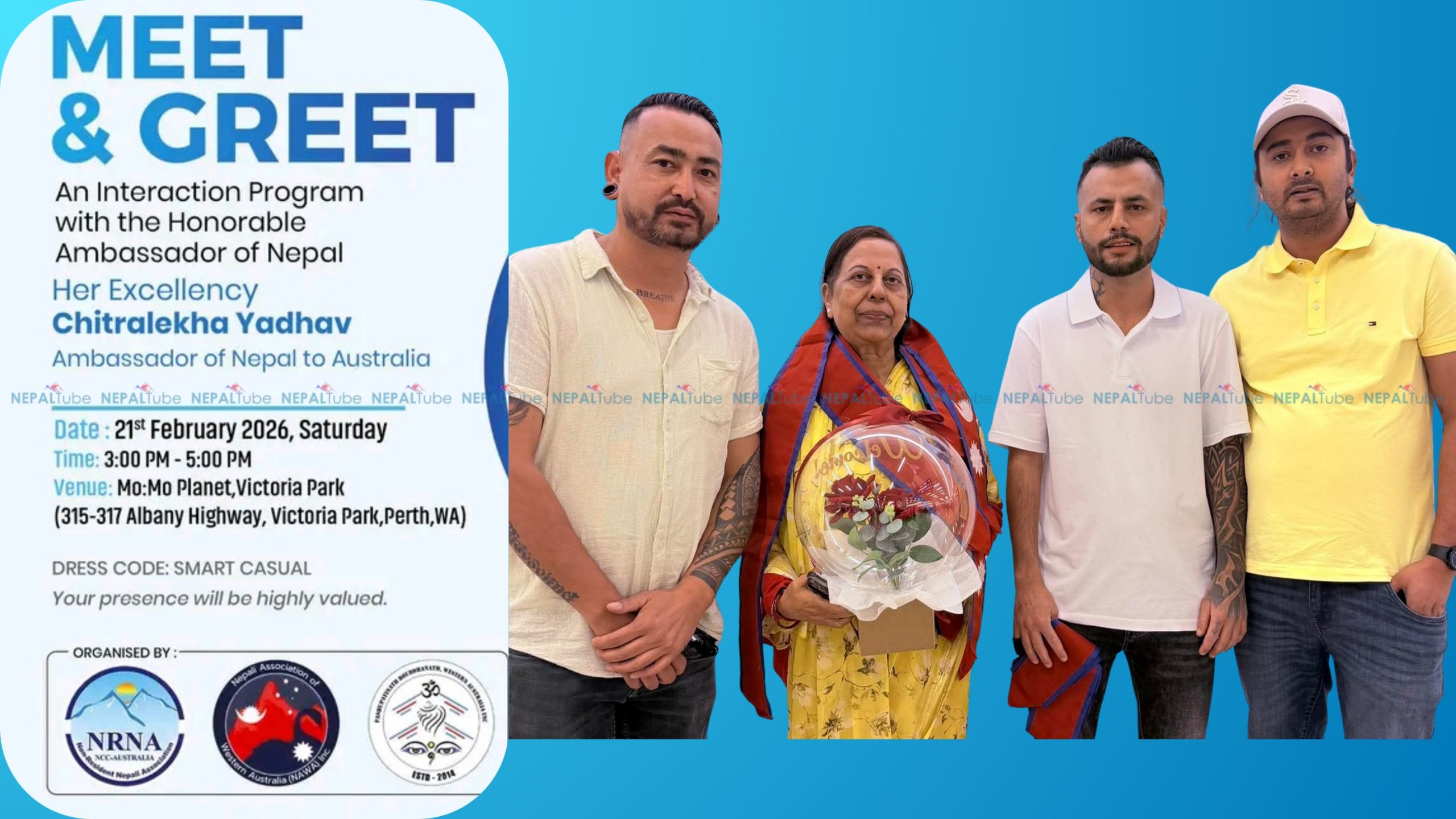 आगामी शनिबार दिउँसो ३ बजेदेखि ५ बजेसम्म Mo:Mo Planet, Victoria Park मा उक्त कार्यक्रम राखिएको एनआरएनए वेस्टर्न अष्ट्रेलियाले जनाएको छ । NRNA Western Australia ले अभियान Nepali Association of Western Australia NAWA Inc. र Perth Nepali Mandir & Community Center (Pashupatinath Bouddhanath Western Australia- PBWA) को  सहकार्य गर्न लागेको हो ।