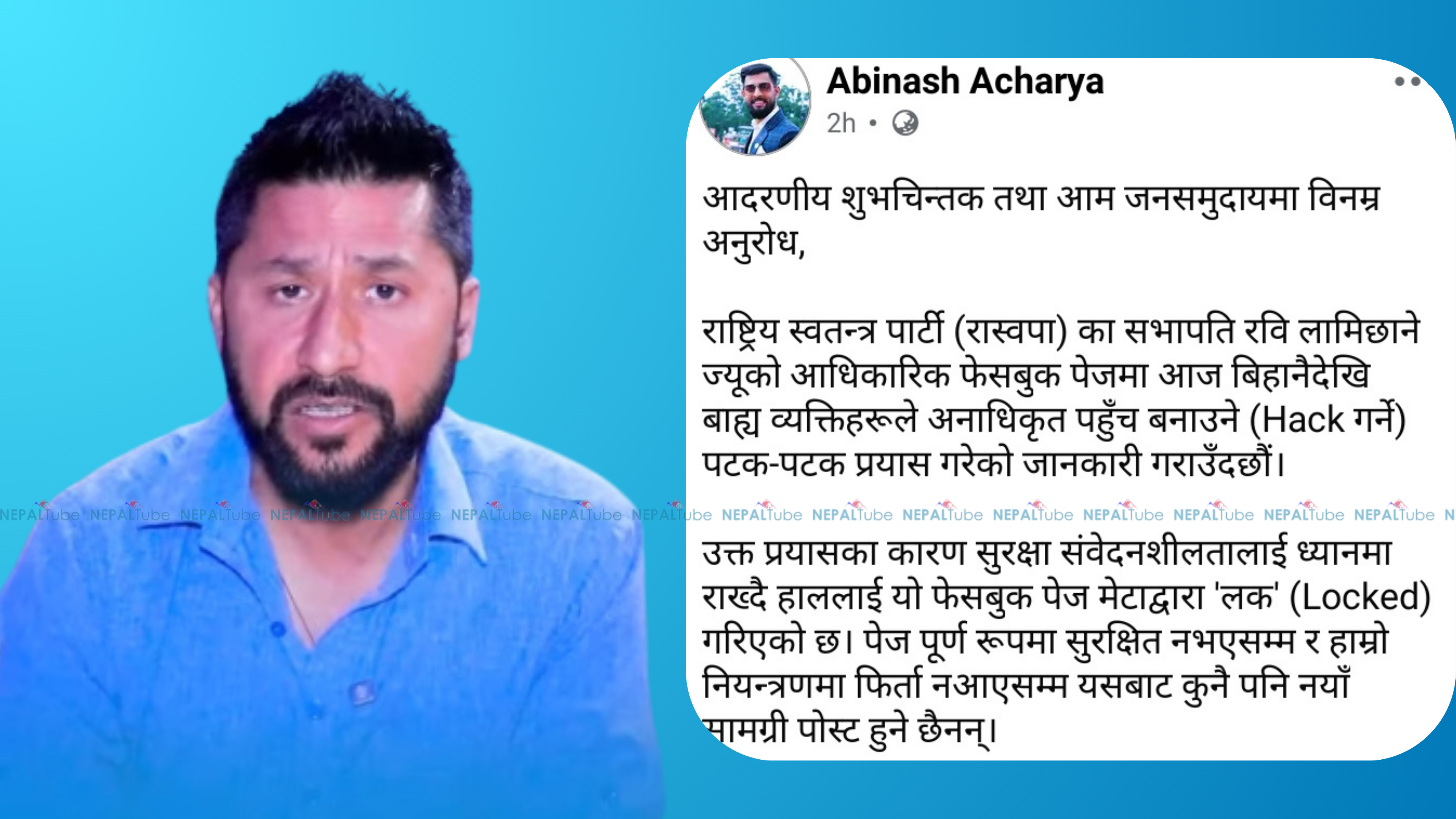 लामिछानेको सचिवालयले अपिल जारी गर्दै पेज बन्द भएको र यसमा कुनै पनि अनधिकृत पोष्टहरु नआउने, आएमा आधिकारिक नहुने जानकारी गराएको हो । रास्वपा सभापति लामिछानेको आधिकारिक फेसबुक पेजमा बिहानैदेखि बाह्य व्यक्तिहरूले अनाधिकृत पहुँच बनाएर ह्याक गर्न पटकपटक प्रयास गरेपछि मेटाद्वारा ‘लक’ गरिएको बताइएको छ ।