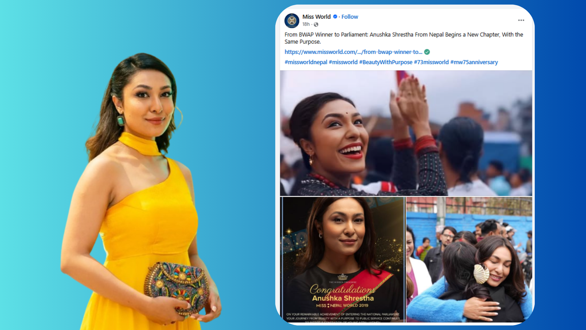 काठमाडौं- मिस नेपाल २०१९ अनुष्का श्रेष्ठलाई हालै संघीय संसद सदस्य भएपछी मिस वर्ल्ड परिवारले आफ्नो आधिकारिक पेजमार्फत बधाई दिएको छ।