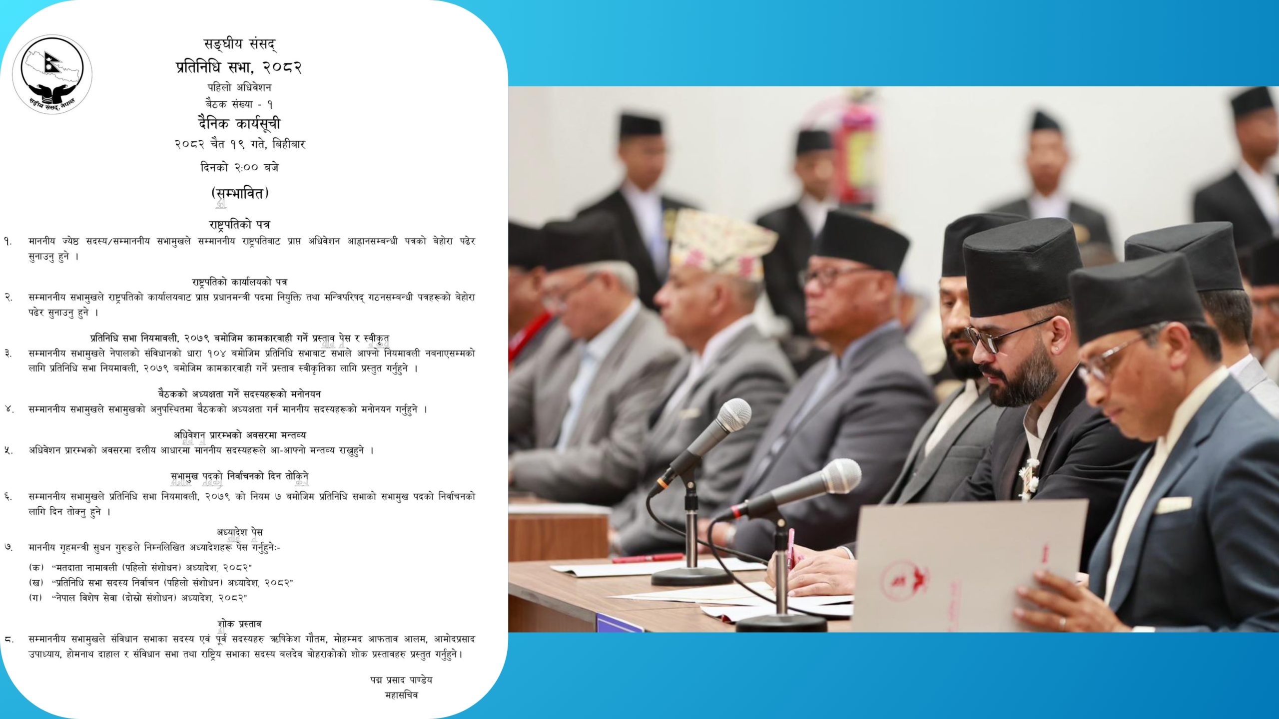 संघीय संसद सचिवालयले पहिलो बैठकका सम्भावित कार्यसूची सार्वजनिक गरेको छ । बैठकको सुरुमा ज्येष्ठ सदस्य अर्जुननरसिंह केसीले राष्ट्रपतिबाट प्राप्त अधिवेशन आह्वानसम्बन्धी पत्रको ब्यहोरा पढेर सुनाउनुहुनेछ । यस्तै राष्ट्रपति कार्यालयबाट प्राप्त प्रधानमन्त्री पदमा नियुक्ति तथा मन्त्रिपरिषद् गठनसम्बन्धी पत्र को जानकारि सदनमा गराइने छ । यस्तै आजको बैठकमा तीन वटा अध्यादेश पेश हुनेछन् । मतदाता नामावली (पहिलो संशोधन) अध्यादेश २०८२, प्रतिनिधिसभा सभा सदस्य निर्वाचन (पहिलो संशोधन) अध्यादेश २०८२ र नेपाल विशेष सेवा (दोस्रो संशोधन) अध्यादेश २०८२ पेश गर्ने कार्यसूची सार्वजनिक गरिएको छ ।